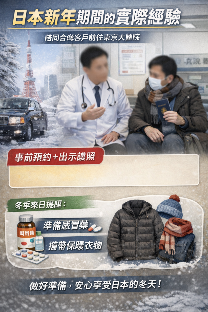 1月1號,一位成交客戶在日本期間不幸感冒,身體狀況明顯不適,因此我陪同他前往醫院就診。由於正值日本新年假期,幾乎所有醫療機構皆未營業,我們只好聯絡東京都內的大型醫院進行安排。