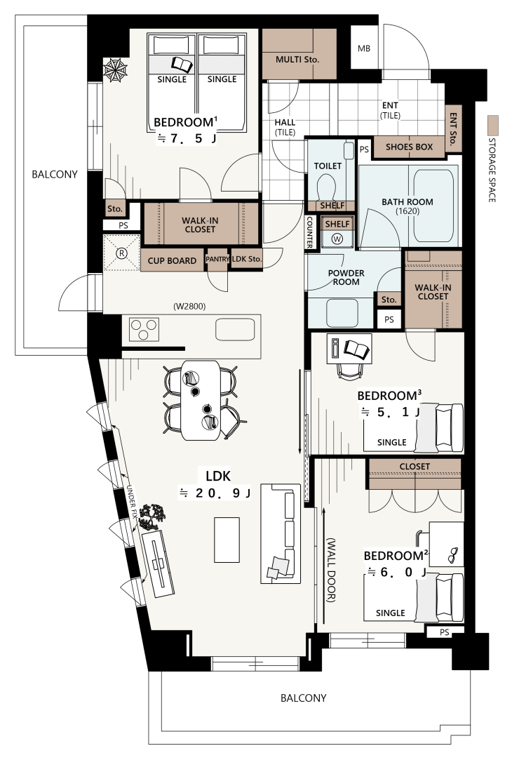 2面バルコニーの南西角部屋