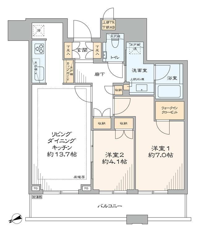 収納豊富な2LDK・WIC付き LDに床暖房